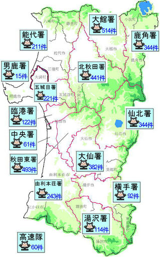 北秋田市332 大館市217 鹿角市174 秋田市174 仙北市148 大仙市136