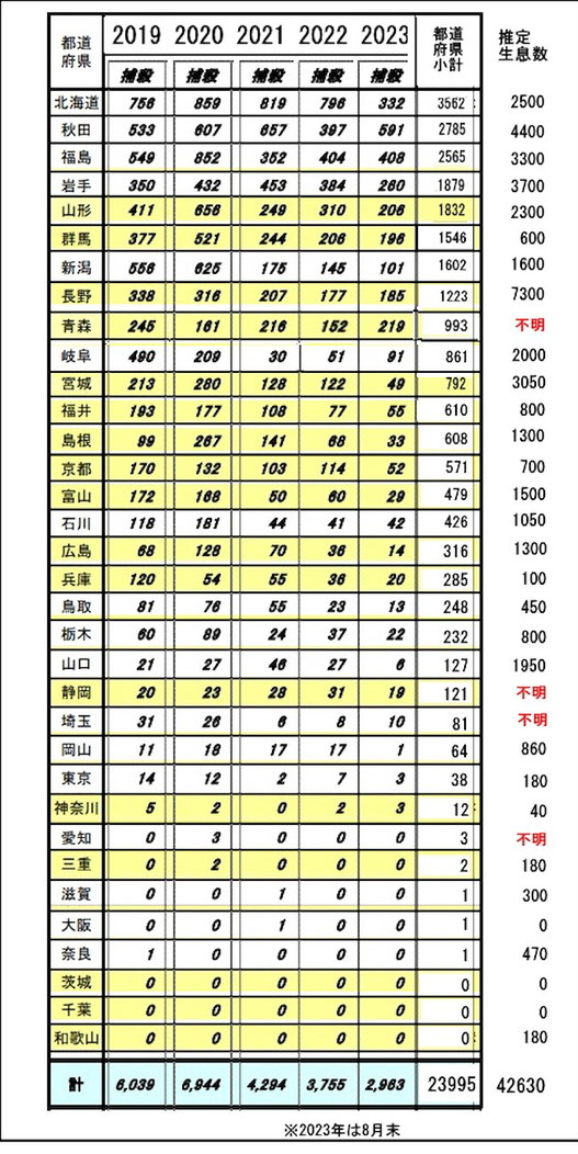 北海道と東北6県での駆除数は2023年(8月末)で14408頭、