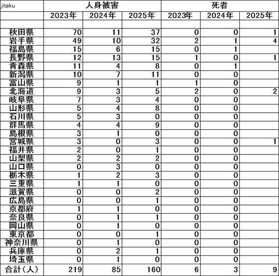 岩手県クマ人身被害 2025年10月16日現在 岩手県ホームページより