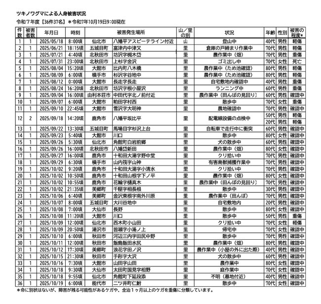 秋田県クマ人身被害 2025年10月19日現在 秋田県ホームページより