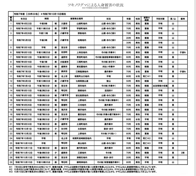 ※9月7日福島県福島市のクマ遭遇バイク衝突転倒骨折重傷事故が、クマ事故と計上されていないため削除しました。この他10月3日長野県大鹿村で発見されたクマによるとされるキノコ狩り行方不明の遺体も、10月は計上されていない事案であり削除しています。